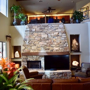 Custom built fireplace 15 feet high x 20 feet wide. Granite, natural stone, and copper foil surrounding TV.